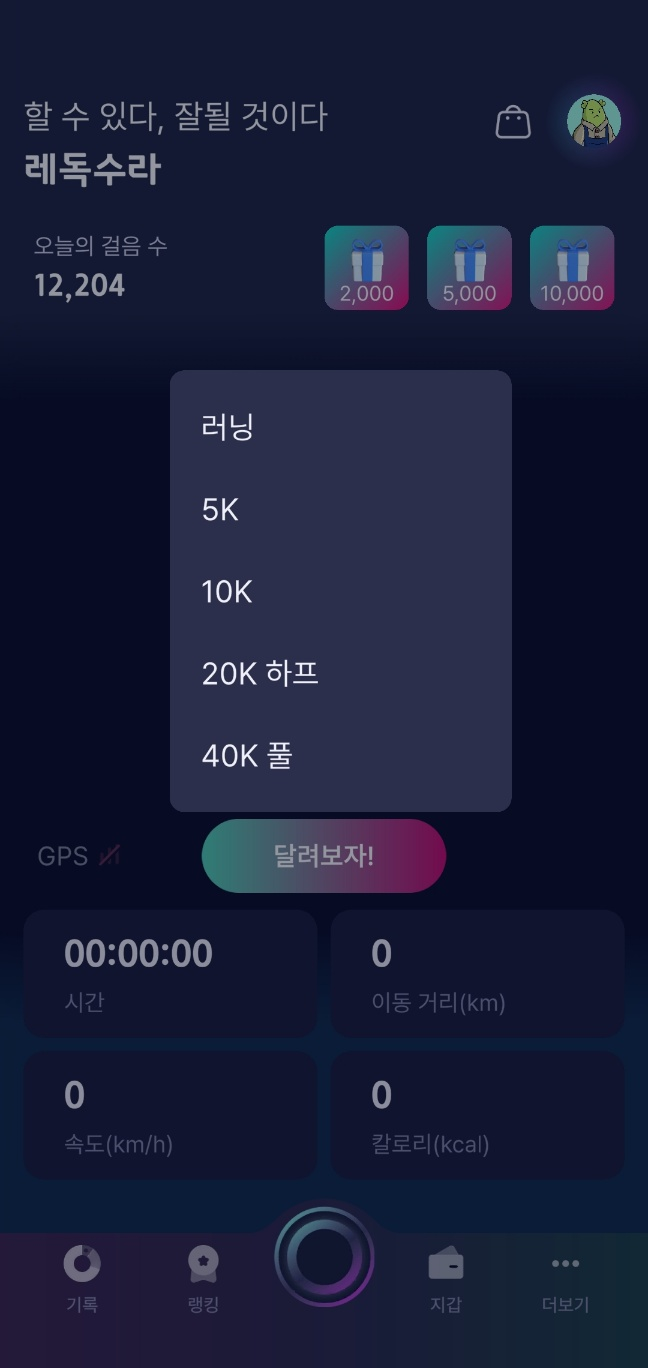중앙의 '달려보자' 버튼을 누른 후 러닝, 5K, 10K, 하프, 풀코스 등 본인 뛰려고 하는 키로수를 누르고 뛰시면 됩니다.