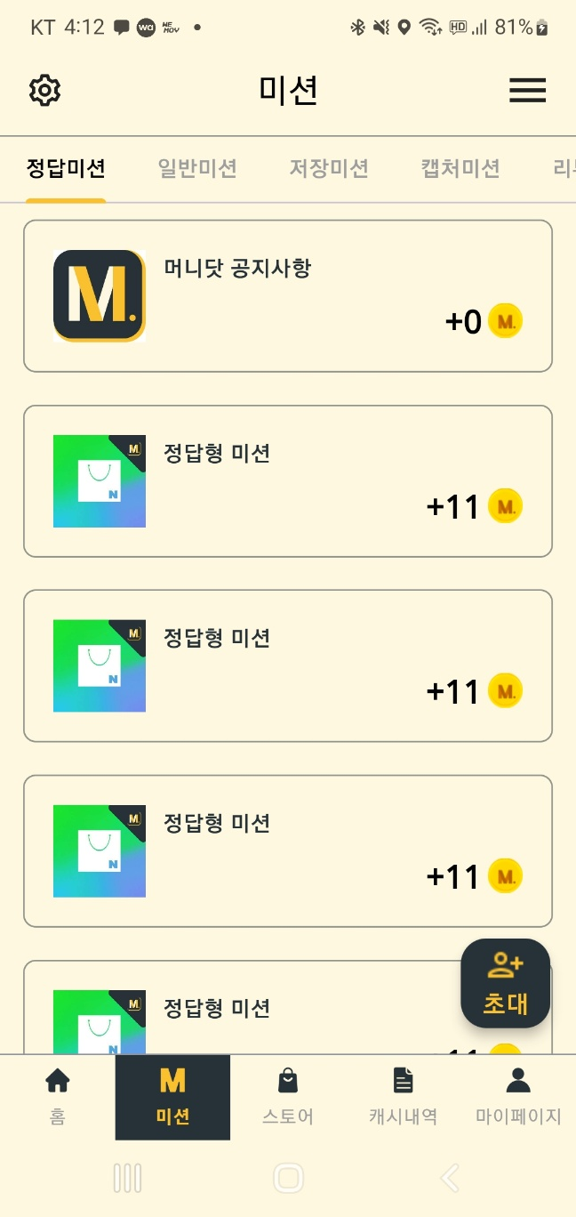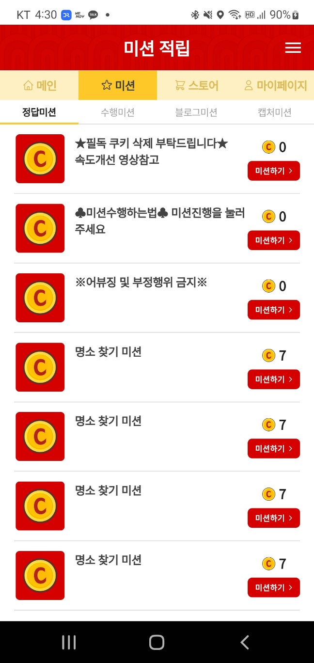 캐시냥은 위와 같은 화면으로 구성이 되어 있고 마찬가지로 미션탭을 누르면 미션내용과 지급 포인트를 확인할 수 있습니다. 미션에 따라서 지급 포인트가 다른 점도 동일 합니다.