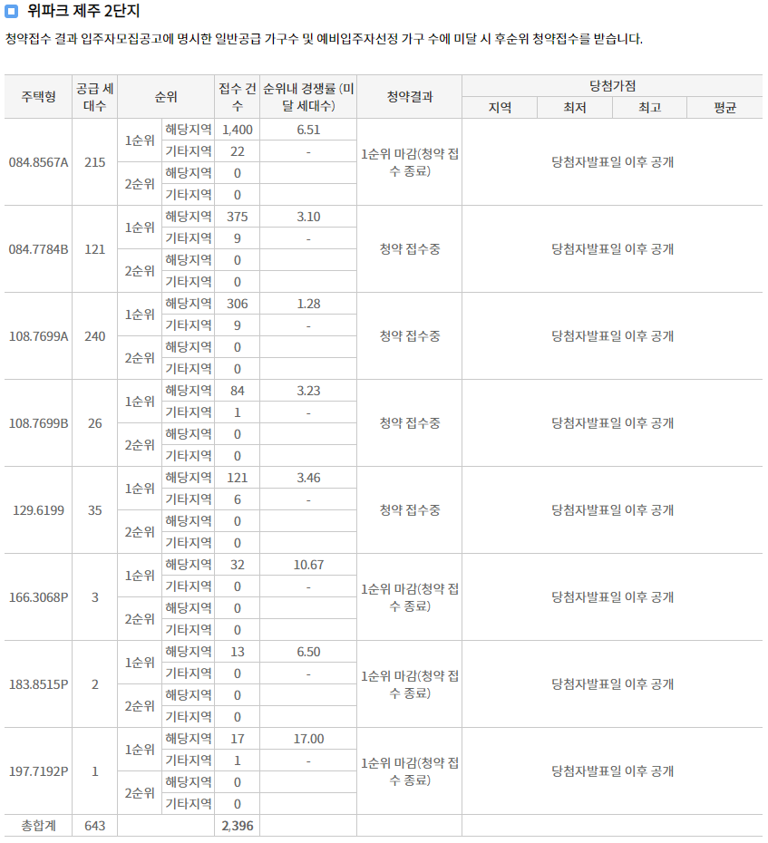 위파크 제주 청약 경쟁률 최대 7.6대 1 기록