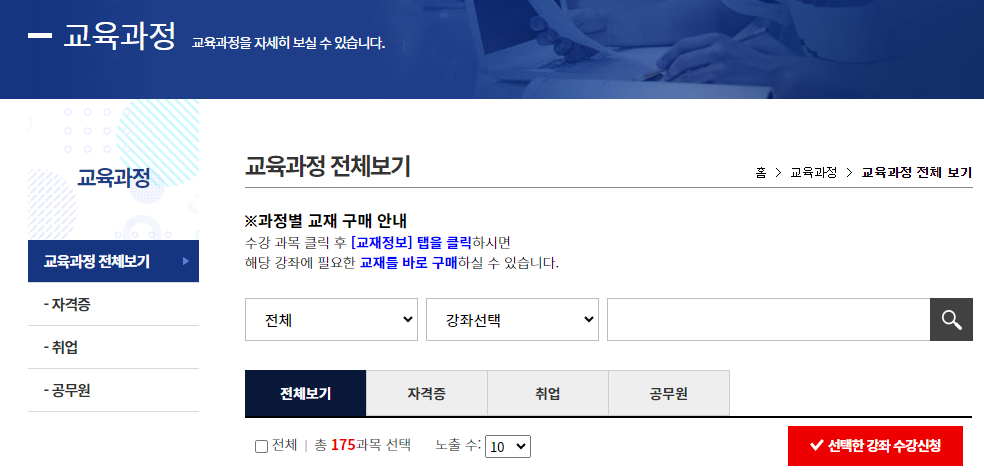 교육과정을 살펴 보면 자격증, 취업, 공무원 카테고리로 각각 구분되는 걸 확인 하실 수 있습니다.