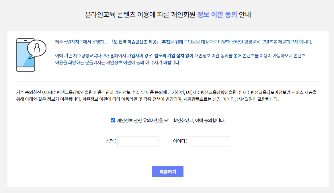 이용을 하기 전에는 아래와 같이 개인회원 정보 이관 동의를 해주셔야 합니다.